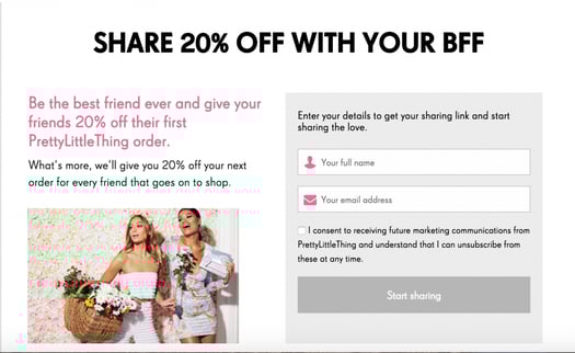 You should also give the referred friend a deal as well as your current customer. For example, Pretty Little Thing will give you and your friend 20% off when you refer and they purchase. This is a quick way to collect customers and easy to customize to your business’ personal promotion goal.